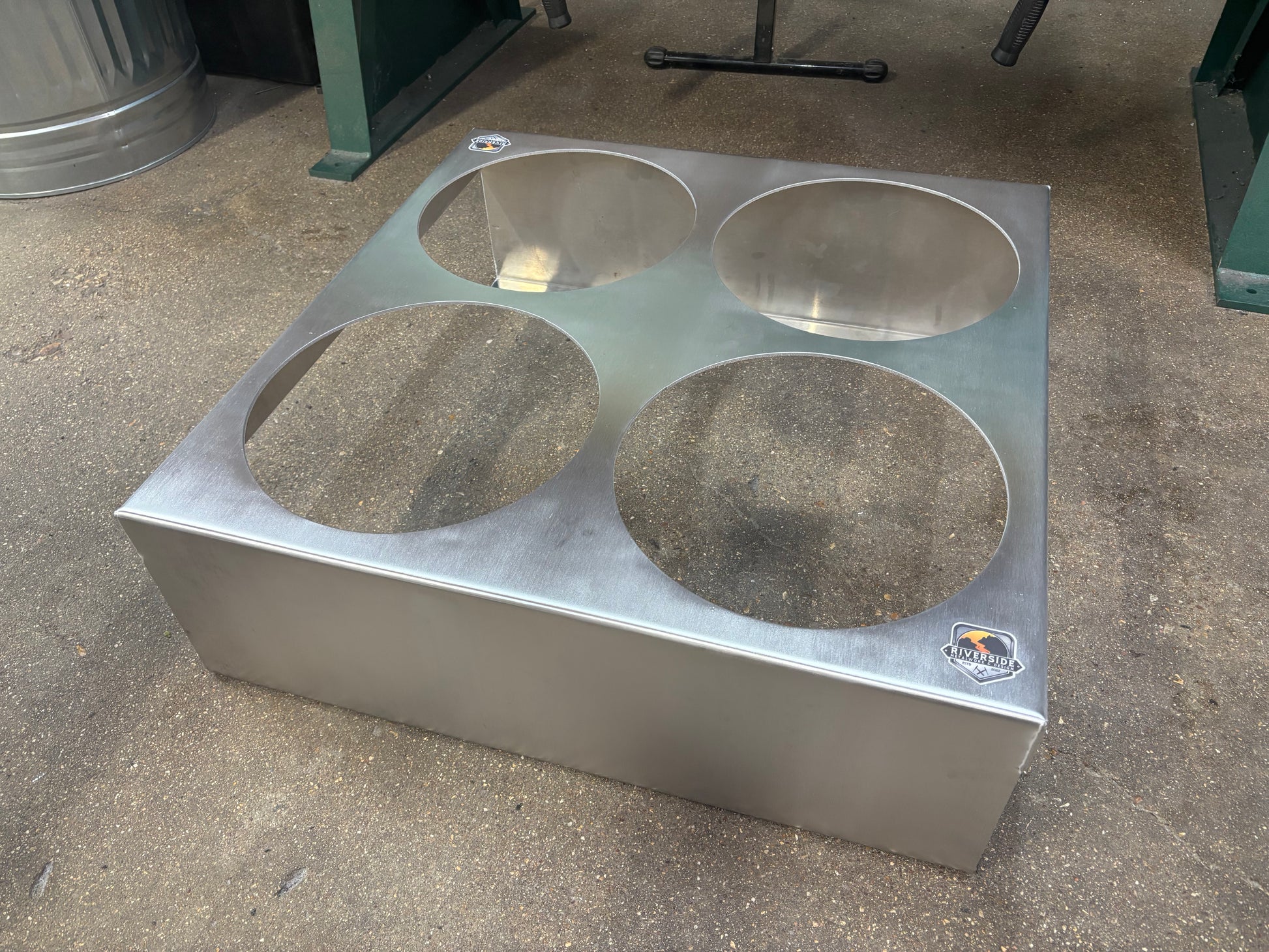 Keep your 5 gallon buckets secure and organized with our aluminum pail holder. Designed to fit most plastic 5 gallon pails, this holder features 11.25" diameter holes for a secure fit. Available in dual (2 pails) or quad 2x2 (4 pails) configurations to match your storage needs. Custom sizes and options available.